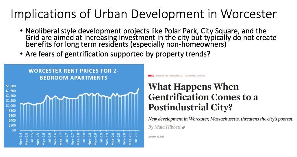 This presentation is the final project from a course on the social applications of GIS. I used publicly available data to analyze Worcester property sales.